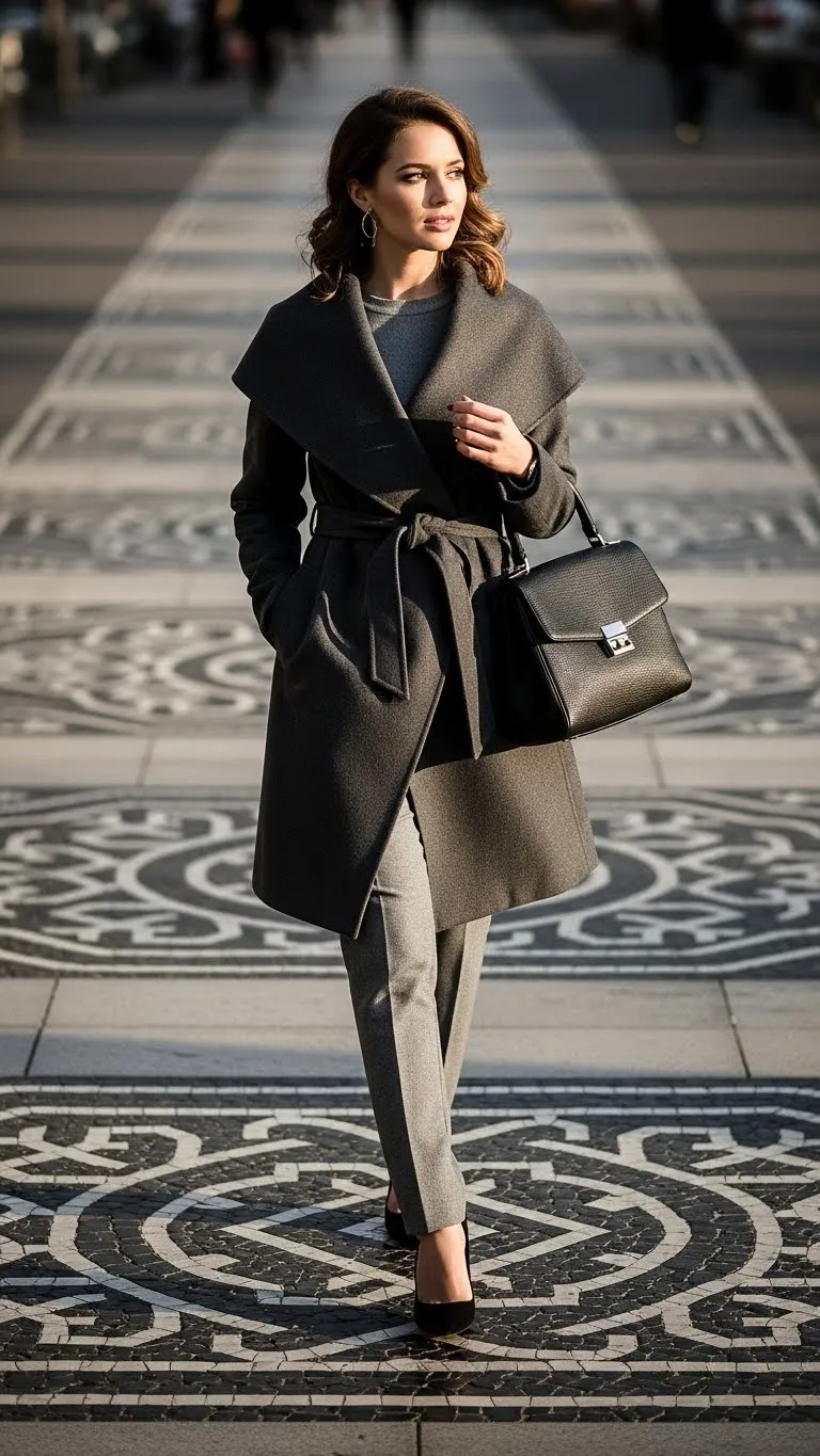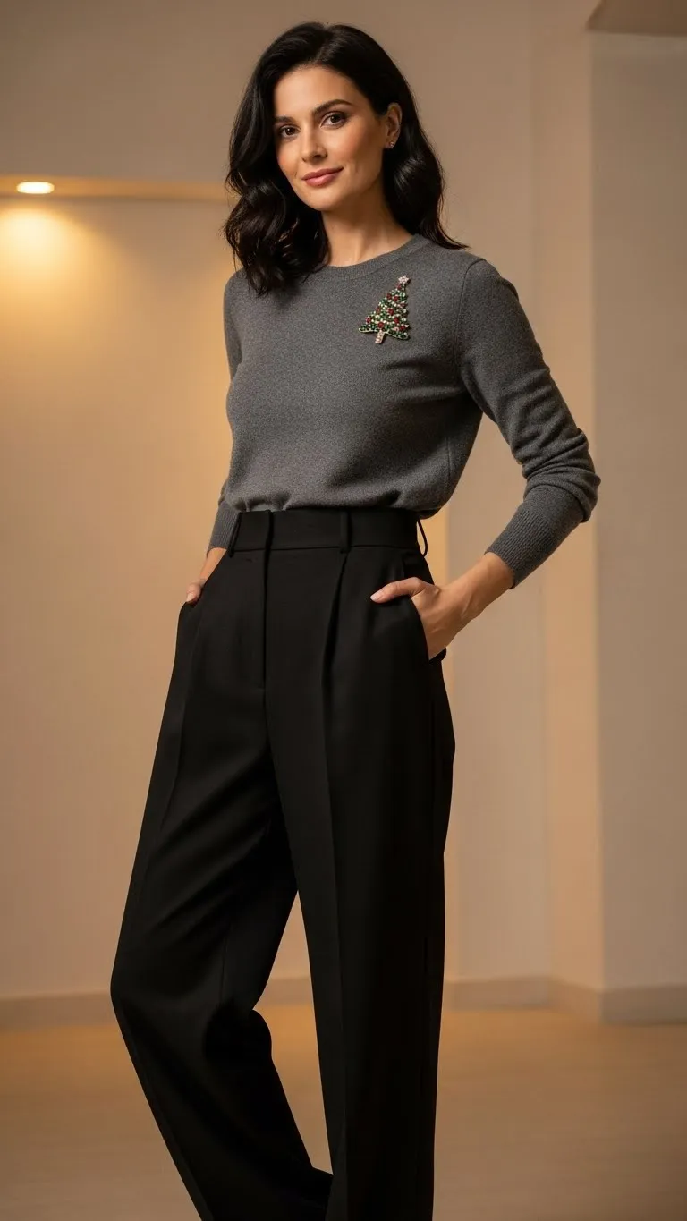 A single brooch can change a plain sweater fast. Wide-leg trousers carry the outfit. Look for vintage pins at flea markets for low cost.