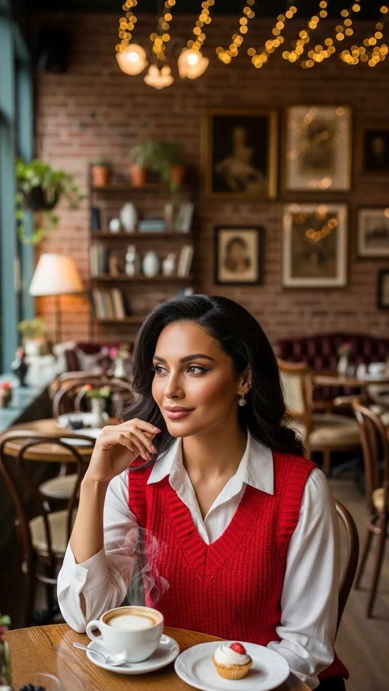 Layering a vest over a crisp shirt gives instant holiday tone. Keep the bottoms simple with jeans or tailored pants. Red vests are easy to find at resale shops. Even a plain sweater can be cut into a vest using fabric scissors and tape. Flat shoes keep it casual while loafers make it feel polished.