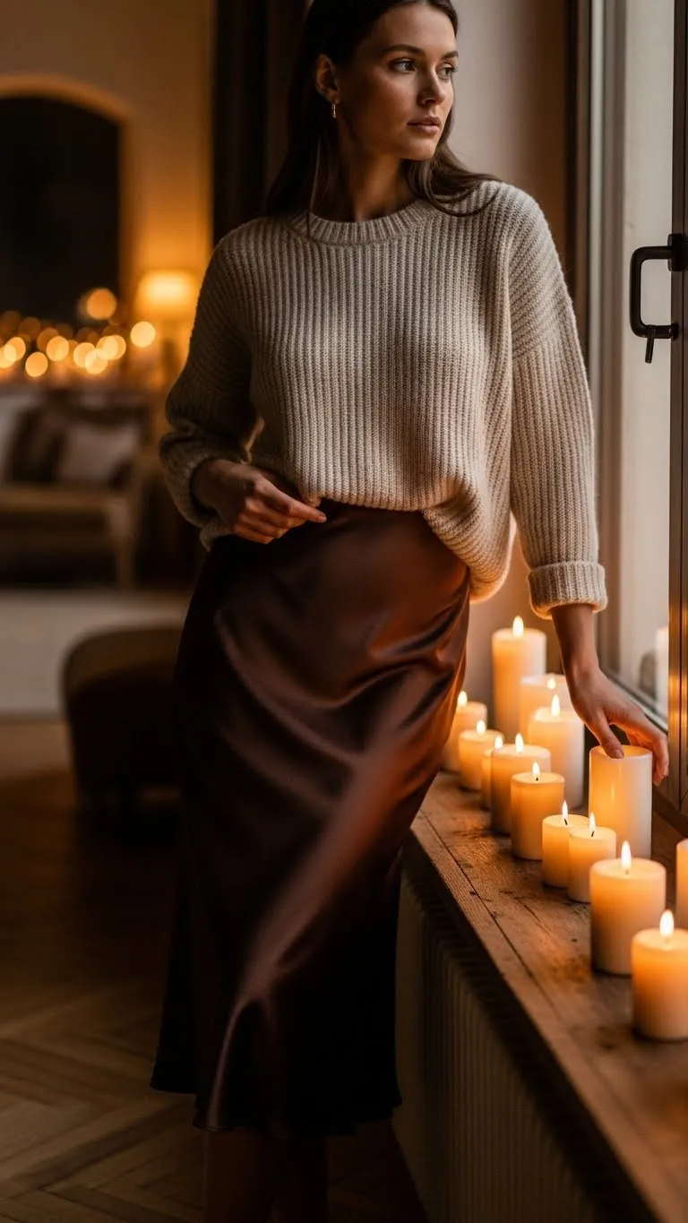 Brown satin catches light softly and feels calmer than metallics. Pair it with a chunky cream sweater for balance. Tuck only the front to shape the waist. Boots ground the outfit for daily wear. Old slip dresses can work as skirts when layered with knits.