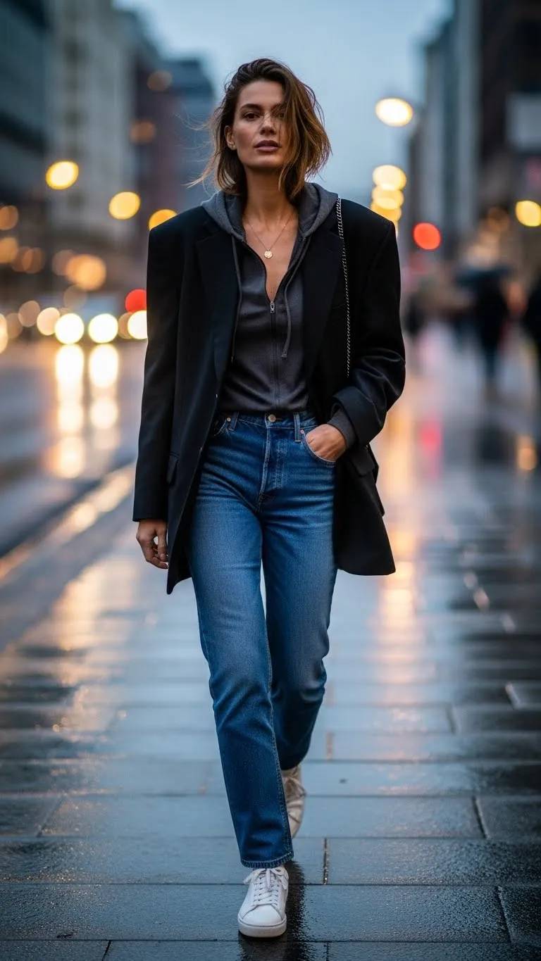 Mixing a blazer with a hoodie keeps things relaxed but styled. Straight jeans keep the shape clean. Stick with black, gray, or cream layers. This outfit works for casual days that still call for structure. Borrowing a blazer one size up from resale shops often gives the right fit.