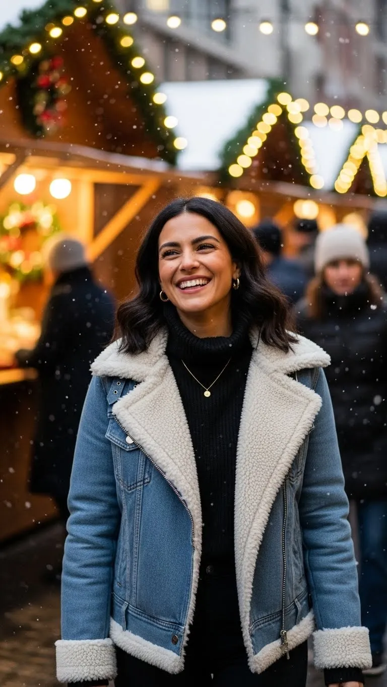 This jacket adds warmth and texture without bulky coats. Keep the rest of the outfit dark so the jacket stands out. Jeans work, but black pants photograph cleaner. These jackets show up often in resale racks in winter.