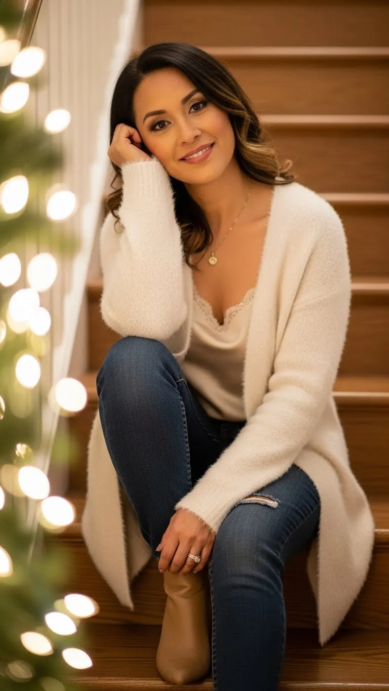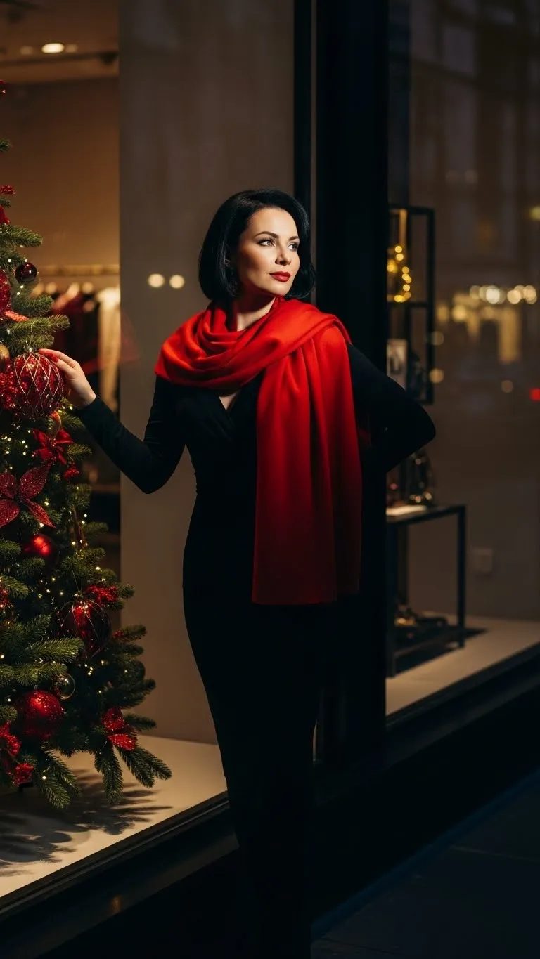 Velvet adds holiday texture without making the outfit feel stiff. Pair a velvet blazer with straight-leg dark jeans and a simple fitted top underneath. Heels shift the look toward evening while loafers or flats keep it day-friendly. This outfit works for office gatherings, dinners, and last-minute plans. Secondhand stores often carry velvet jackets after party season for very low prices. If the blazer feels stiff, wash it gently and hang dry to soften the fabric. Add a small sparkly pin or chain necklace for subtle shine. This look feels dressed without being overdone and is easy to repeat with different tops.