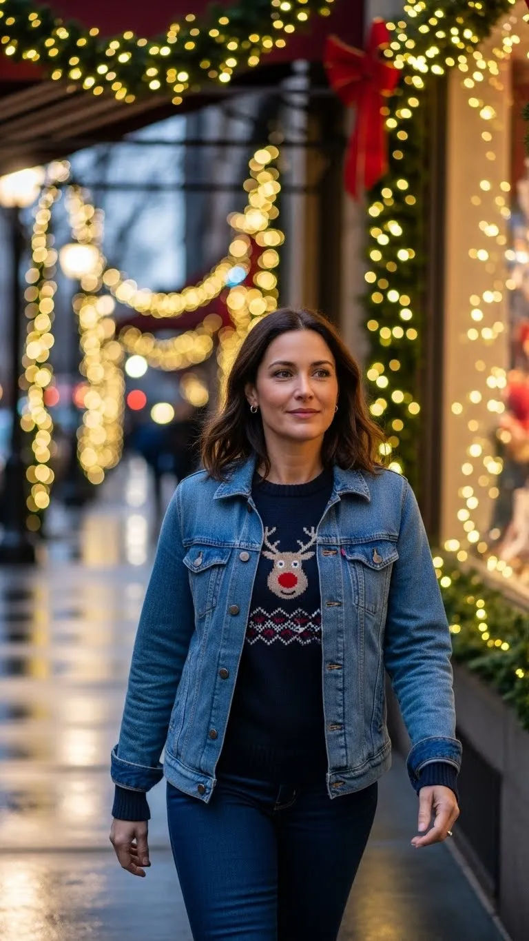 Layering a casual denim jacket over a festive sweater keeps the look relaxed and practical. This works well for outdoor events, markets, and walks. Iron-on patches, pins, or holiday buttons can personalize an old jacket in minutes. Small add-ons change familiar items fast without added cost.