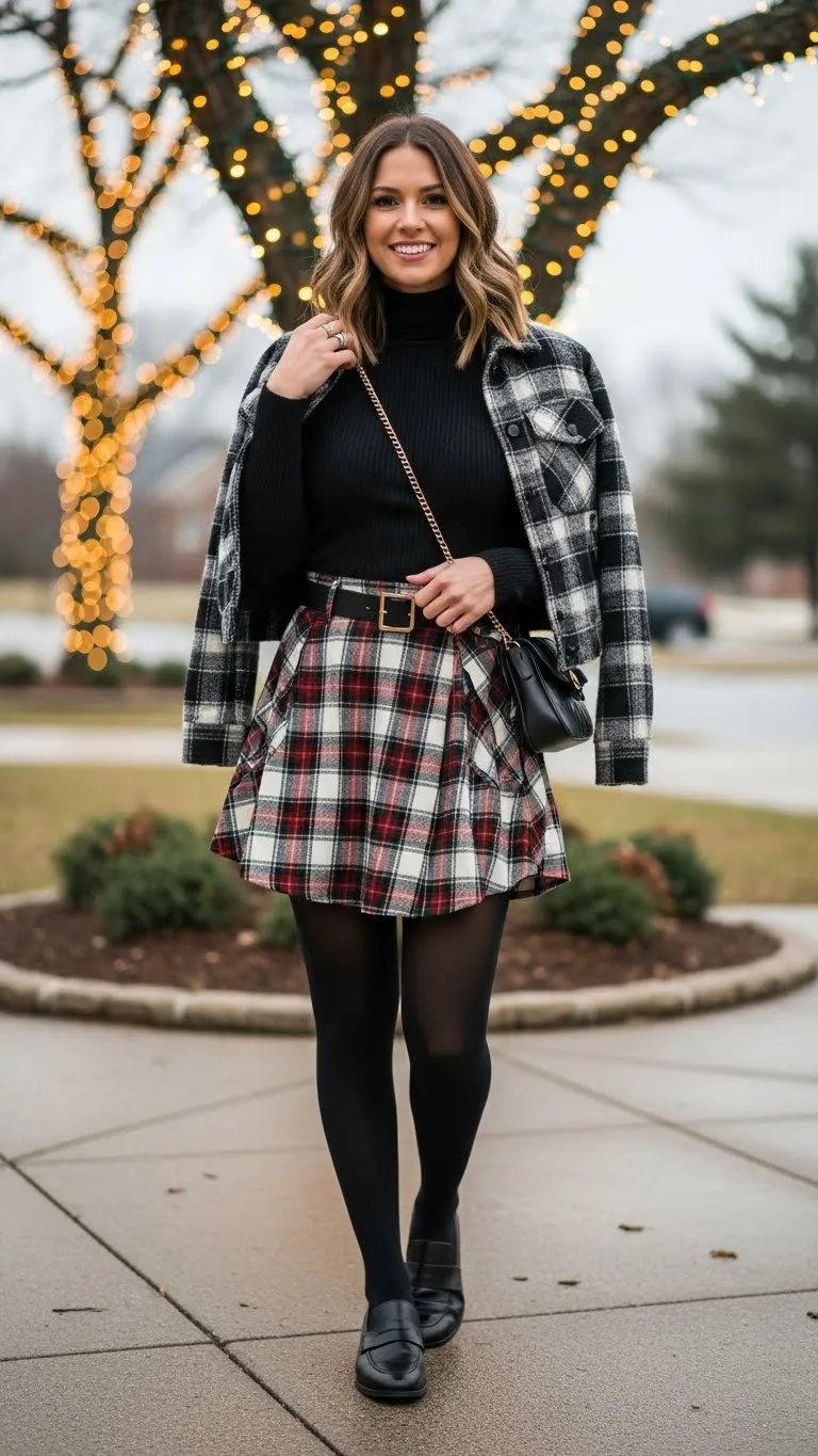 Plaid fits winter moods naturally and pairs easily with solid basics. A plaid skirt with a fitted turtleneck and black tights works for family events or casual parties. Add loafers or ankle boots for comfort and a short jacket for balance. If the skirt rides up, biker shorts underneath add comfort without bulk. Men’s plaid shirts can even be turned into makeshift skirts using a belt and safety pins. This outfit feels playful, seasonal, and easy to rebuild from items already in most closets.
