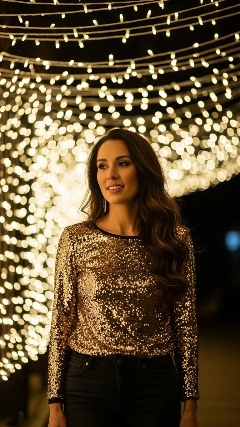 Sequins bring instant party energy without needing a full dress. Pair a sequin top with dark straight-leg jeans to keep things balanced and easy to wear. Black boots or heels keep the outfit grounded. Thrift stores often carry sequin pieces after event season at very low prices. Hair can stay simple in a low pony or loose waves so the top remains the focus. This outfit feels special while staying comfortable and easy to repeat.