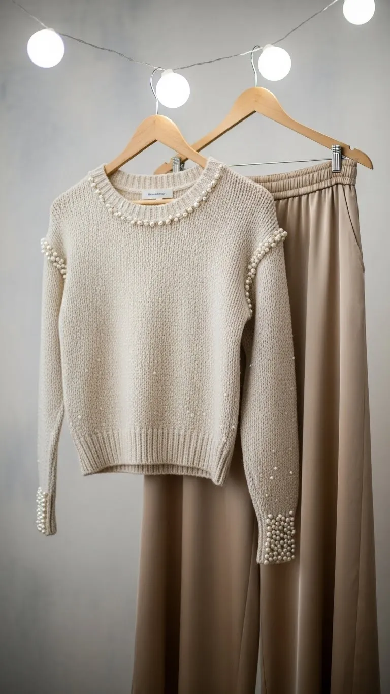 - Pearl-Trim Sweater With Satin Pants