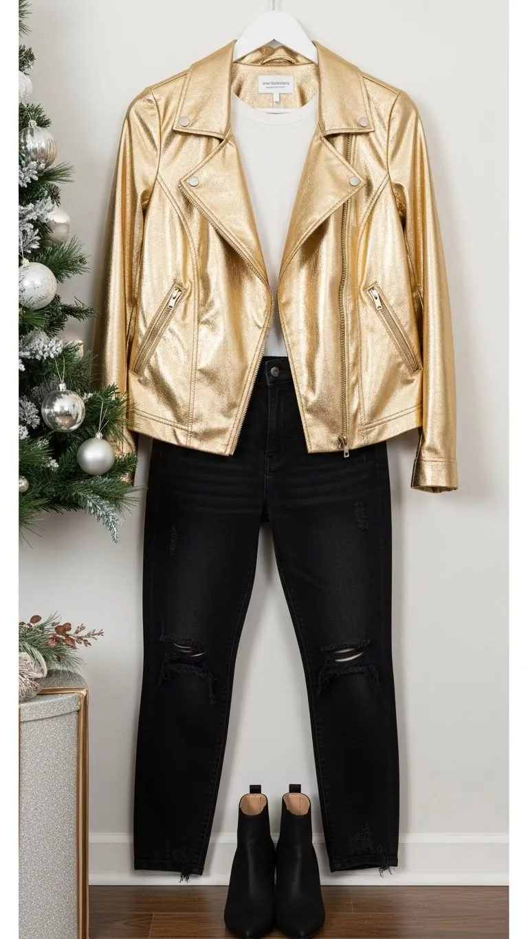 A gold jacket can make even casual jeans feel party-ready. Keep your top plain to avoid competing textures. Add ankle boots for height. You can distress the jeans slightly for contrast. If the jacket feels too bold, push up the sleeves for a more relaxed shape. This combo works well for casual parties where you still want to look sharp.