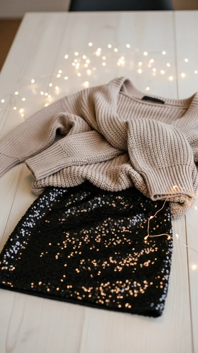 A sequin skirt always draws attention. Pair it with a soft sweater for contrast. Tuck the sweater slightly at the front. Add simple heels or flats. If you want to dress it down, wear ankle boots. Add a simple necklace. You can sew a few sequins on the sweater cuffs to tie the pieces together.