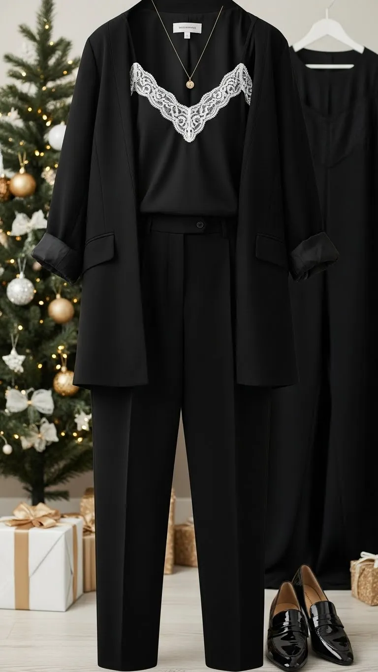 A black suit gives a sharp shape. Add a lace camisole for softness. If your suit is oversized, roll the sleeves for a relaxed touch. Add slim heels or shiny loafers. A small pendant pairs well with the lace. You can sew a thin trim onto the camisole to make it feel more custom. Quick, easy, and polished.