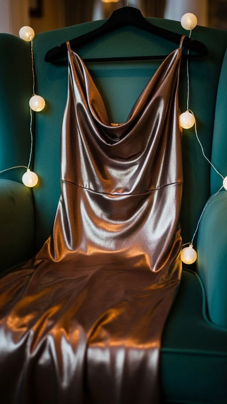 A bronze cowl-neck dress glows under warm lighting. Keep accessories simple. Add a wrap or shawl if you prefer coverage. You can shorten the hem yourself with fabric tape for a cleaner line. Add neutral heels. A simple hairstyle like a low bun keeps attention on the dress.