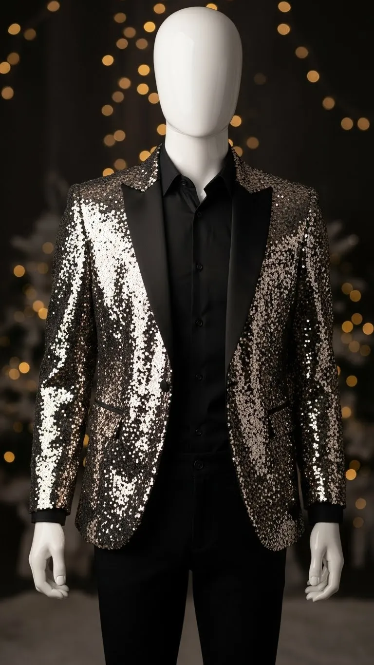 A sequin blazer turns even the simplest base into a party outfit. Throw it over black jeans and a black tank. The monochrome base looks smooth and lets the blazer shine. Look for thrifted blazers; many end up donated after one wear. Tailor the sleeves by rolling them slightly for a relaxed shape. Add a clutch and a thin necklace. Keep makeup simple so the sequins stand out.