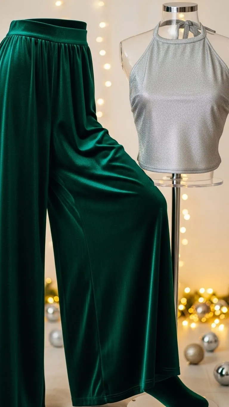 Velvet pants always read rich. Choose a pair in midnight blue or plum. Pair with a halter top for contrast. If the halter feels too bare for winter, layer a thin cardigan over your shoulders. Add bangles or a cuff bracelet from your jewelry stash. You can sew a small piece of lace onto the back of the halter to give it a prettier shape without spending extra.