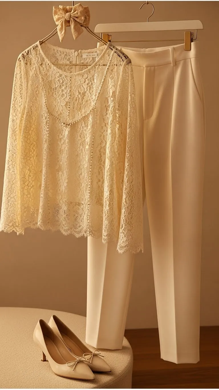 A lace top feels festive instantly. Pair it with crisp trousers for balance. If your lace top is sheer, wear a simple tank under it. High-waist cuts help create a long line down the body. Swap heels for pointed flats if you want comfort. Add a bow hair clip for charm. You can even glue tiny beads along the lace edges for a custom finish.