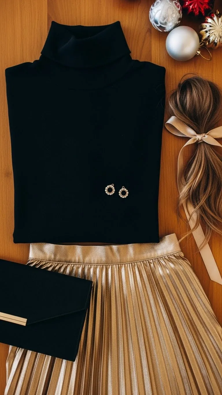 A black turtleneck is always sharp. Pair it with a gold skirt for contrast. Pleated styles catch the light well. If you want something more low-key, try bronze instead of gold. Add simple studs and a black clutch. A thin gold ribbon tied around your ponytail ties the outfit together without spending anything. This combo photographs well because the colors pop under warm lights.