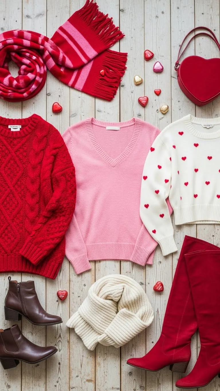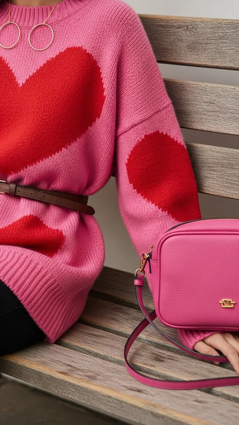One of the easiest ways to elevate a Valentine sweater is by mixing patterns and textures thoughtfully.
