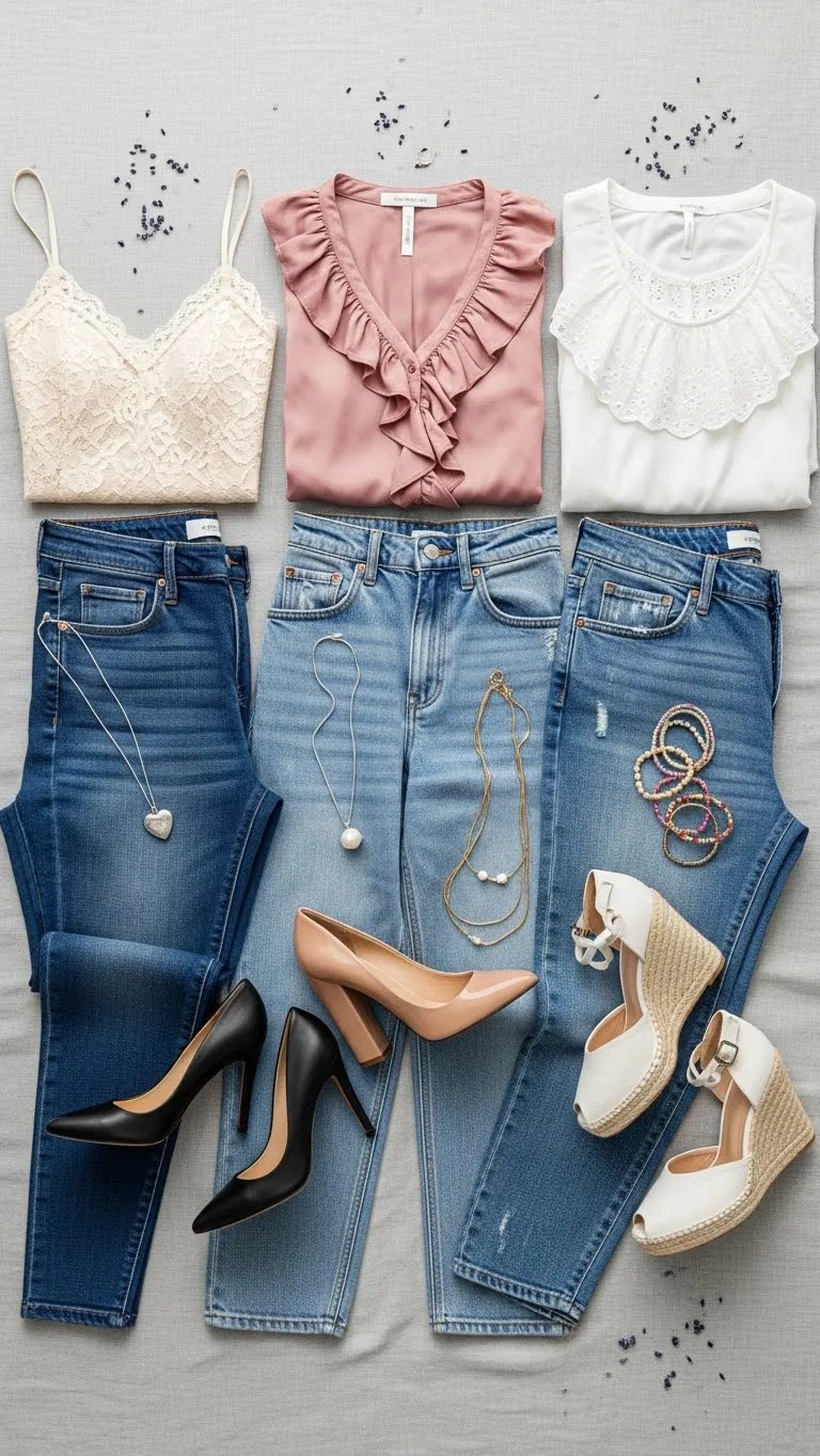 - Shoes: Heeled ankle boots, pointed flats, or sleek loafers can transform casual denim into date-worthy style.