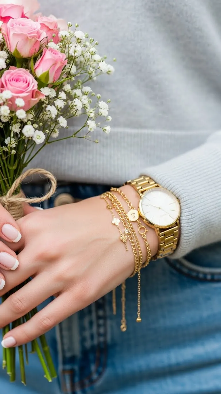 - Jewelry: Small gold hoops, delicate necklaces, or a charm bracelet add subtle sparkle.