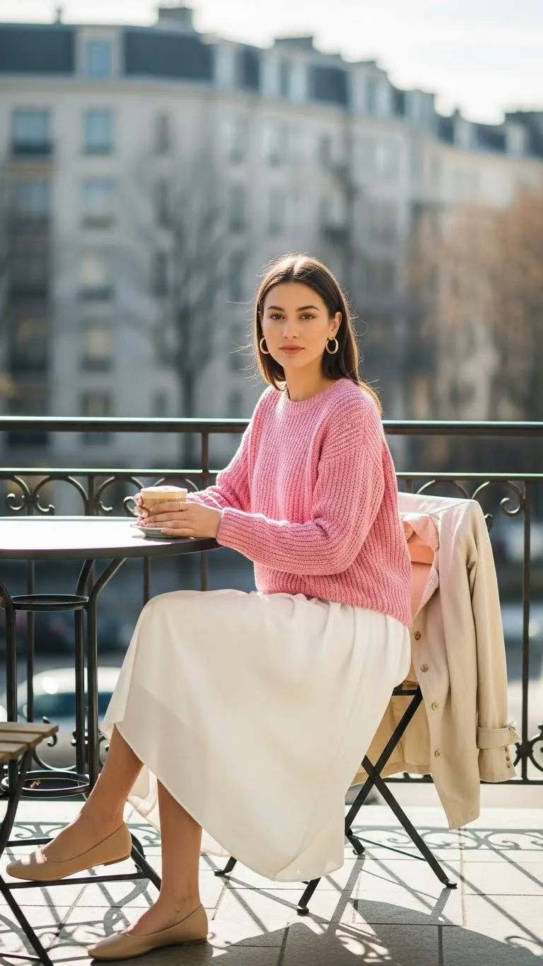 - Soft Pink Sweater with White Midi Skirt