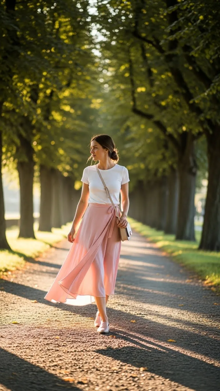 Wrap skirts are flattering and versatile. Pair with a fitted tee for a relaxed feel. Add slip-on flats or sandals. For budget styling, DIY a skirt with lightweight fabric and a belt. Add simple jewelry to polish the look. Tuck in the tee slightly to define your waist. This outfit works well for indoor cafes or sunlit outdoor brunches, providing ease and feminine charm.