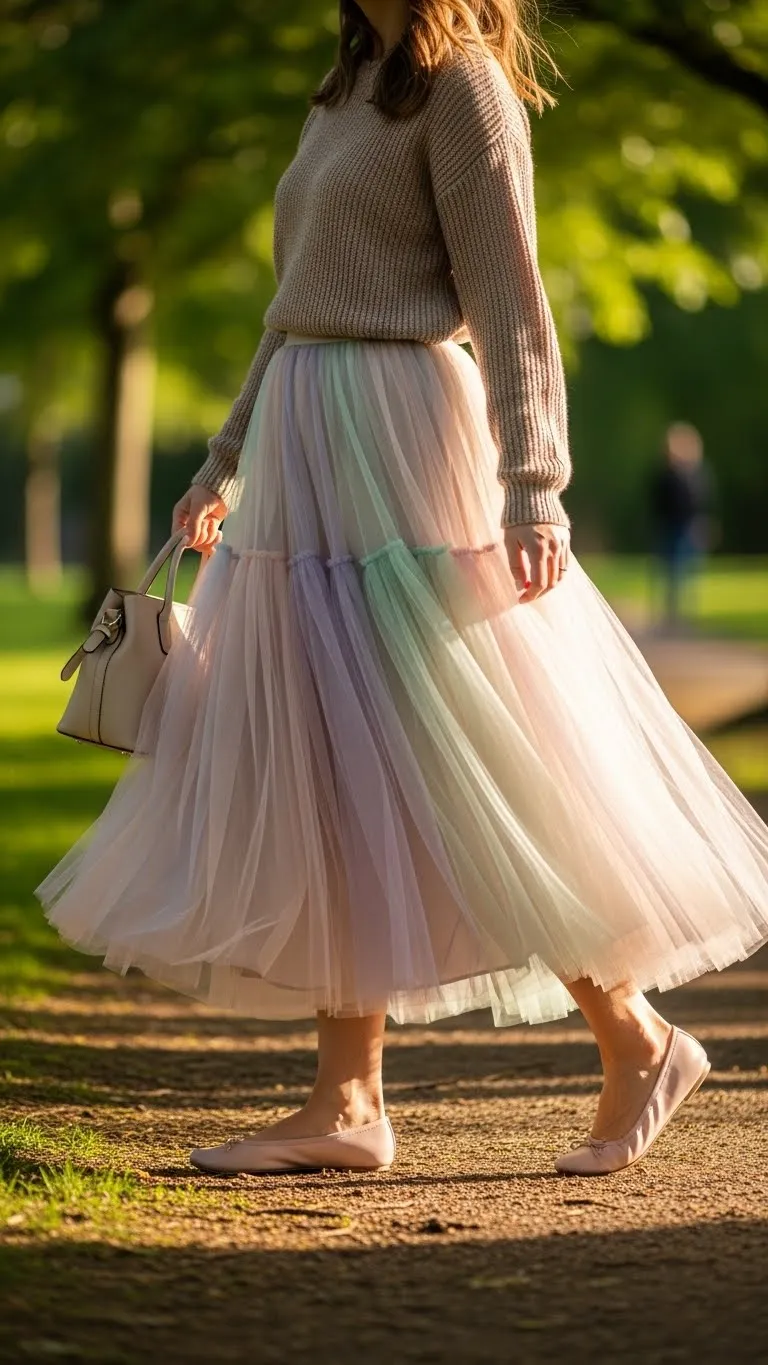 Tulle skirts create gentle movement and charm. Pair with a cozy sweater for casual balance. Flats or ballet shoes keep it brunch-friendly. Budget tip: layer tulle from fabric remnants over a simple skirt for a DIY effect. Accessorize lightly with a chain necklace or simple earrings. Perfect for playful, daytime brunch settings where you want to feel feminine without overdressing.