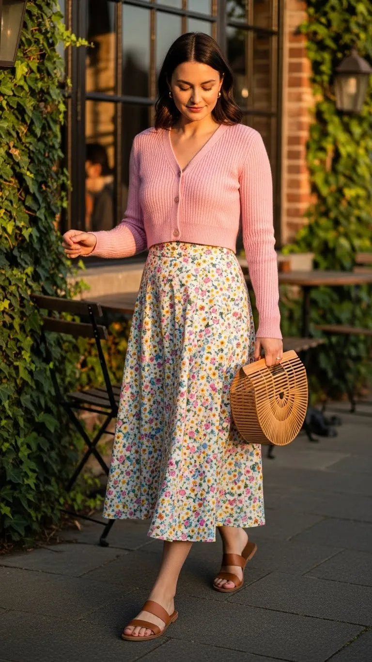 Cropped cardigans give proportion and charm. Pair with high-waist skirts for flattering shape. Flats or sandals complete the look. DIY: shorten an old cardigan with scissors and hem it for a playful fit. Minimal jewelry, like small hoop earrings, keeps it light. This outfit works for casual or semi-formal brunches, offering feminine energy with ease.