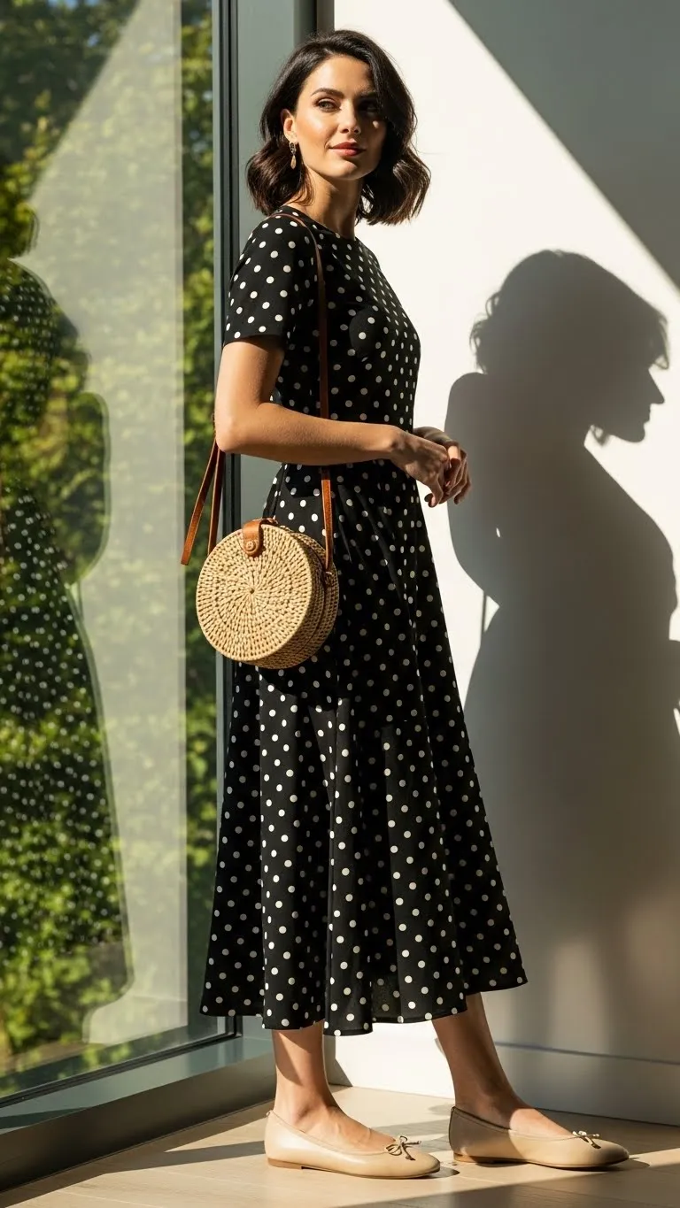 Polka dots are playful without being over-the-top. A midi length keeps it brunch-appropriate. Pair with comfortable flats or low heels. DIY style tip: add a thin belt to define your waist. Budget-friendly finds include second-hand stores or online sales. Pair with minimal gold or silver accessories to complement the pattern. This outfit works with soft waves or a low bun, giving an easy, chic vibe that’s perfect for daytime events.