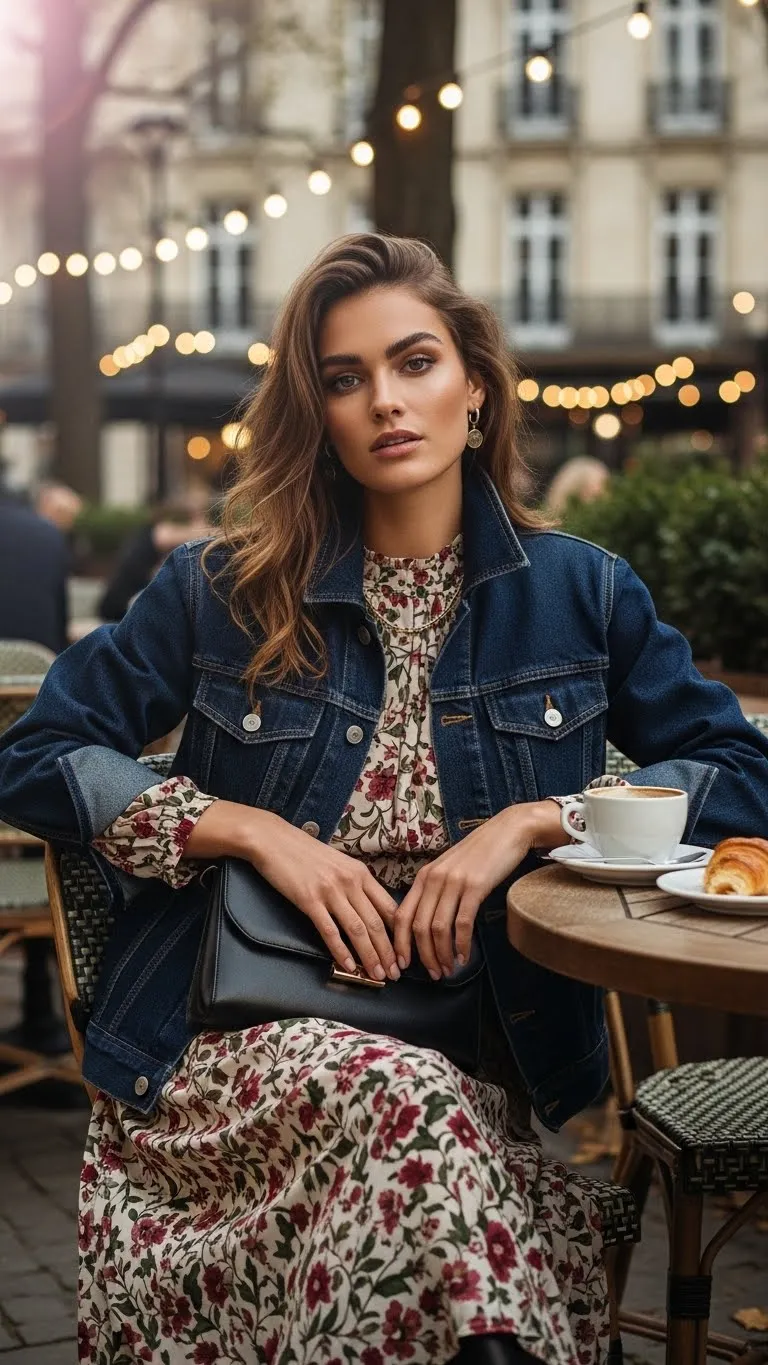 A denim jacket grounds romantic dresses and makes them wearable. Dark wash denim reads cleaner and more refined than distressed styles. Vintage denim from thrift shops often has better structure. Roll sleeves slightly and pair with ankle boots or flats. This outfit feels relaxed, balanced, and thoughtfully styled.