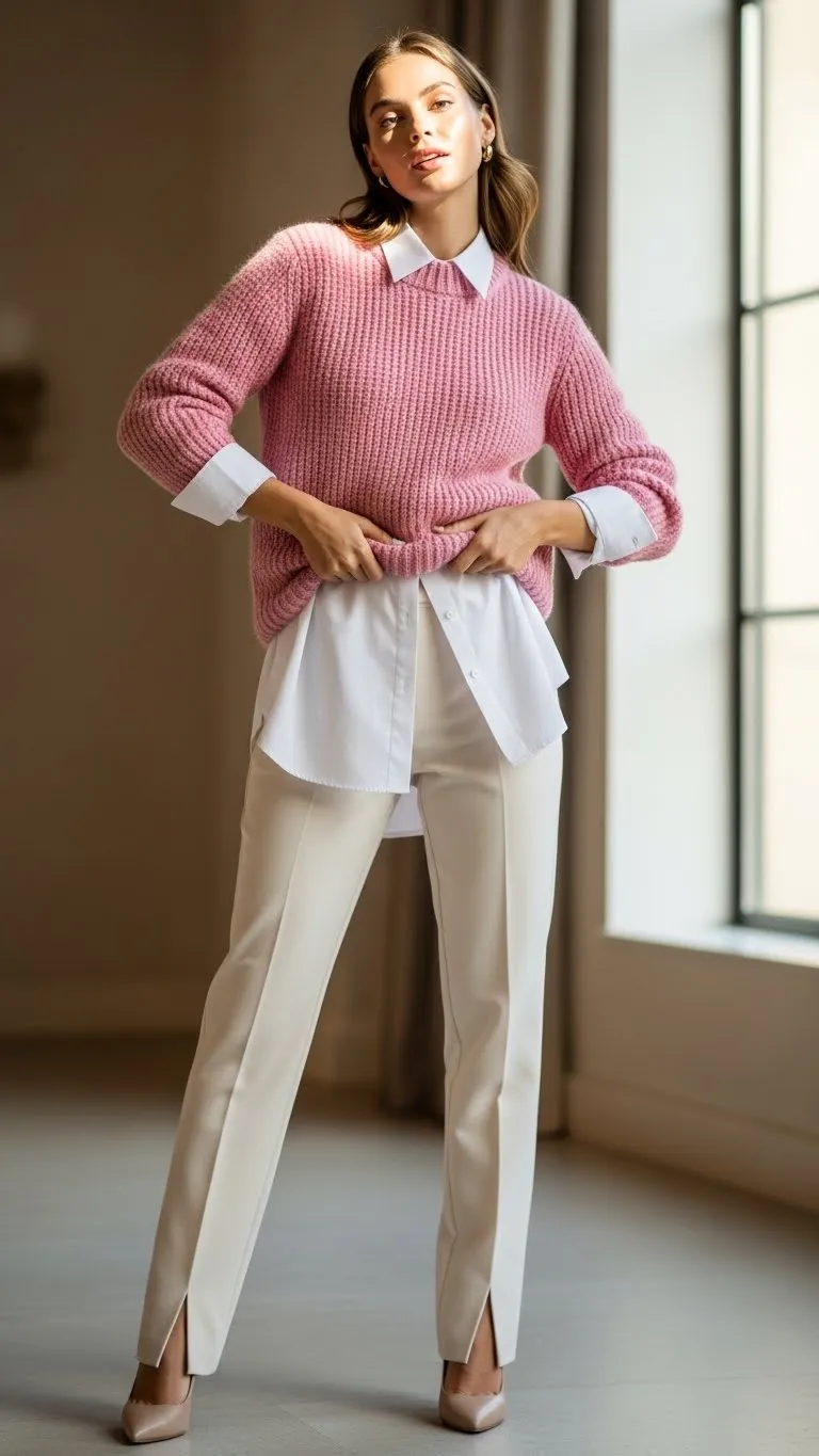 Layering a soft knit over a crisp button-down creates structure without stiffness. The shirt adds clean lines while the knit softens the overall feel. Choose gentle tones like blush, cream, or pale gray to keep the look calm. Let the collar and cuffs peek out slightly so the outfit feels intentional. Thrift stores are great for men’s button-downs since thicker cotton holds shape better and costs less. Roll sleeves once under the knit for a styled effect. Pair with straight-leg pants or a midi skirt and keep footwear simple with loafers or ankle boots. Avoid busy prints so the layers stand out. A quick steam on the collar keeps everything neat. For added shape, try a slim belt worn over the sweater. This outfit works well for casual dinners and daytime dates while still feeling polished and confident.