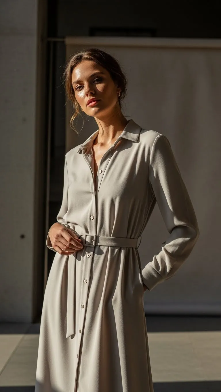 A slim belt transforms a button-down dress by defining the waist. Keep the dress pressed and buttons aligned for a clean look. Pair with boots or flats. This outfit works well from day to night and feels calm and polished.