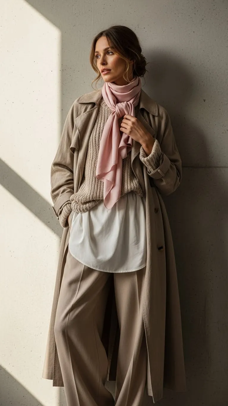 A trench coat instantly makes an outfit feel put together. Adding a knit scarf introduces texture and warmth without overpowering the look. Neutral trench colors like beige, stone, or soft gray work best for layering. The scarf should be lightweight and loosely draped to keep the look relaxed. Underneath, keep the outfit simple with a knit top and straight pants or a dress. Thrifted trench coats often have excellent structure, so focus on fit through the shoulders. Replace missing buttons if needed for a cleaner finish. This outfit works well for daytime dates or evening plans when temperatures drop, offering both comfort and quiet polish.