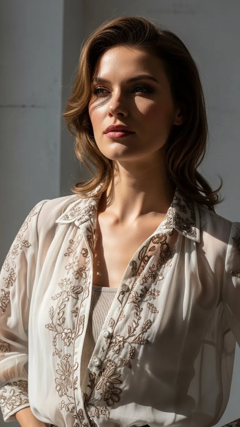 Sheer layers add depth when styled simply. Choose a smooth, fitted cami underneath and avoid patterns. Soft colors feel more refined than bold shades. Pair with tailored pants or a skirt and keep accessories minimal. Use double-sided tape to hold collars or cuffs in place so lines stay clean. This look feels romantic without effort and suits evening dinners or quiet date nights.