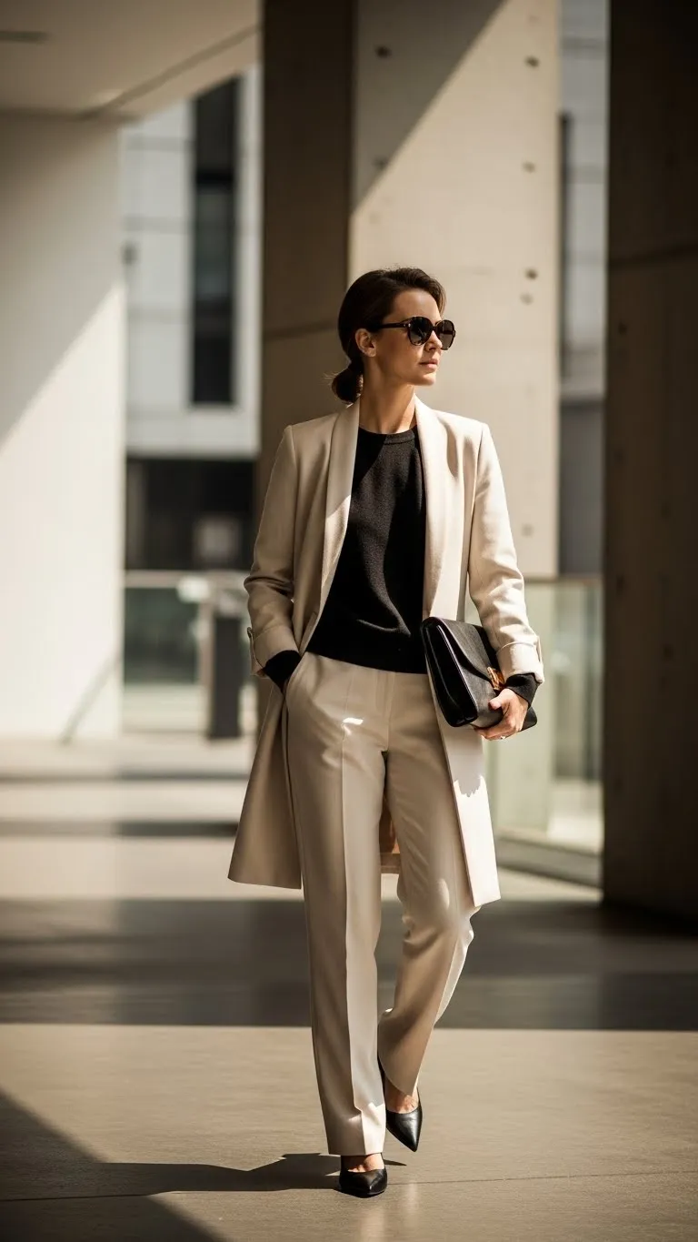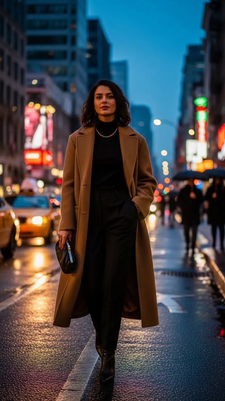 A monochrome base instantly reads polished because the eye moves smoothly from head to toe. Adding a long coat on top creates drama and shape. Stick to one color family underneath like black, beige, or soft brown. Keep fabrics simple such as cotton knits, ribbed tops, or straight trousers. Thrift stores often carry wool coats with great weight and structure. Check lining and buttons, then replace buttons if needed for a cleaner look. Wear simple boots and minimal jewelry. Leaving the coat open allows movement and keeps the outfit relaxed. A lint roller makes a big difference since clean fabric always looks refined. This outfit works well for evening walks, dinners, or casual events while feeling put together.
