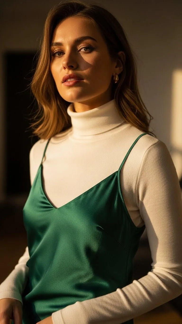 Layering a thin turtleneck under a slip dress makes the outfit feel styled and practical. Choose a fine fabric so it sits smoothly without bulk. Neutral tones like ivory, beige, or soft pink work best. Look for satin dresses on clearance or secondhand, focusing on length rather than brand. Midi lengths feel calmer and more refined. Pair with ankle boots or ballet flats and keep accessories minimal. If the straps slip, use fashion tape at the shoulders to maintain clean lines. This look feels romantic while staying comfortable and works well for dinner dates or evening plans.