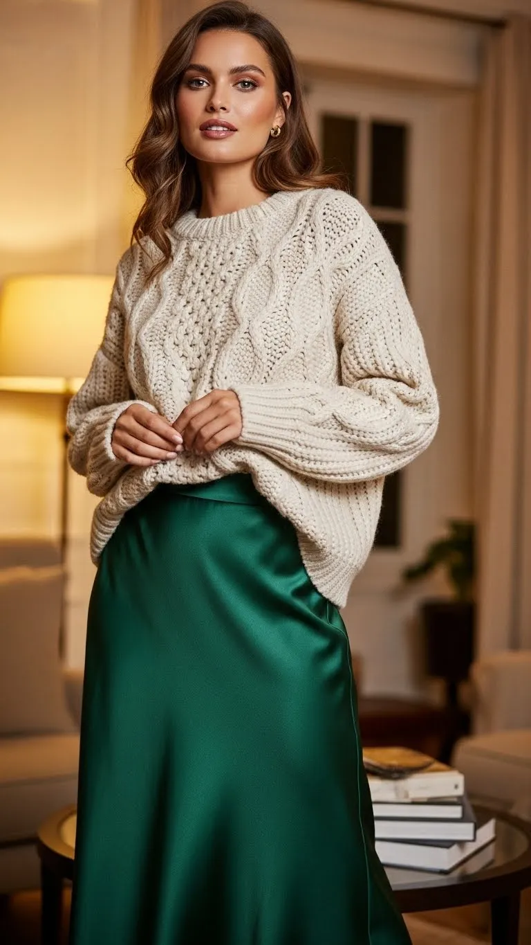 Mixing textures like satin and knit adds depth. The soft shine of the skirt contrasts nicely with heavier knits. Tuck the sweater slightly at the front to create shape. Neutral colors help the textures stand out without clashing. This outfit feels cozy yet refined for evening plans.