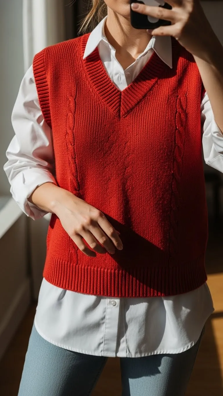 This preppy-inspired look is effortless and stylish. Layer a red knit vest over a crisp white button-up for an outfit that feels intentional without much effort. Button-ups are wardrobe staples, and vests are inexpensive if purchased second-hand. Pair with dark jeans or straight-leg pants for a classic touch. Loafers, ankle boots, or even sneakers can complete the look depending on the setting. For DIY personalization, add a small pin or embroidered heart patch to your vest. This outfit works for brunches, casual office days, or coffee dates. Keep jewelry minimal: a thin chain necklace or studs will suffice. A soft blush or red lip enhances the Valentine theme subtly. The combination feels polished but not fussy, which is why people save this look repeatedly. The layering trick also makes it wearable in slightly cooler weather.
