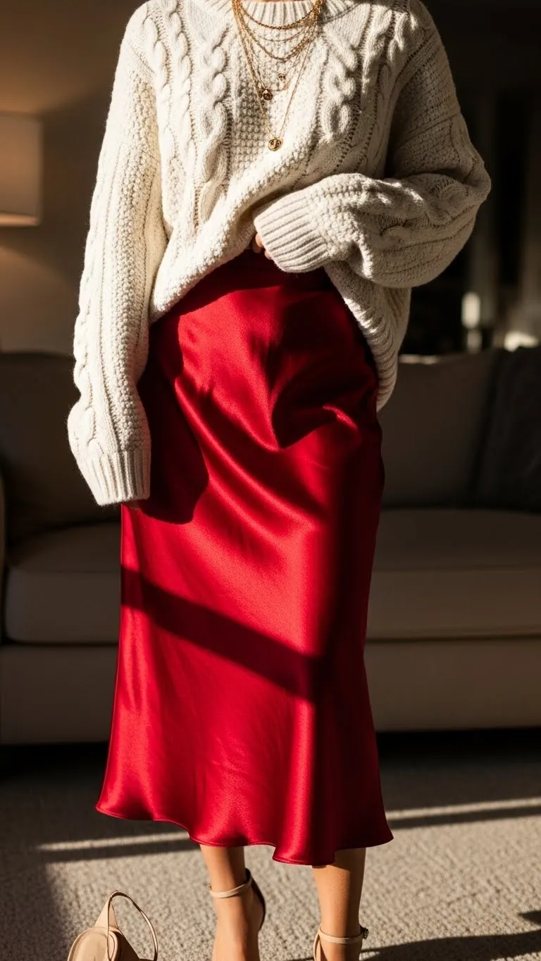 Pairing a satin skirt with a chunky sweater gives balance between elegance and comfort. The shiny satin feels dressy, while the oversized sweater keeps the outfit casual and approachable. You can find satin skirts on sale online or thrifted for under $15, making it budget-friendly. Neutral sweaters work best to complement the skirt, or try a soft pink or cream for a subtle Valentine’s tone. Ankle boots or loafers complete the look. For DIY styling, tuck the sweater into the waistband slightly or add a belt to define your silhouette. Accessories should remain simple: delicate necklaces or a watch. This outfit works for romantic dinners, evening walks, or casual coffee dates. Its charm lies in versatility—you can wear the skirt later with a fitted top or the sweater with jeans. People save this outfit idea because it combines comfort, affordability, and style seamlessly.
