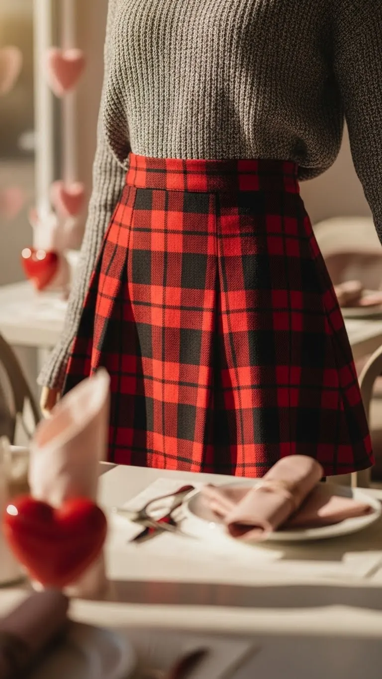 A plaid skirt instantly adds a playful and festive feel, perfect for Valentine’s Day. Pair it with a neutral or cream sweater to balance the bold pattern. Tuck the sweater slightly into the waistband to create a polished yet relaxed silhouette. Thrift stores often carry plaid skirts for under $15, making this look very budget-friendly. For footwear, ankle boots, loafers, or even sneakers work depending on how casual you want to be. Layer tights underneath if it’s chilly. Accessorize minimally with a delicate necklace or small hoop earrings. You can also add a small hair clip or ribbon for a subtle Valentine touch. This outfit works well for coffee dates, casual dinners, or walks around the city. It’s versatile because you can swap the sweater for a turtleneck or blouse for a slightly different vibe. Many people save this combination because it’s timeless, practical, and easy to repeat in various ways throughout winter. You can remix the pieces with other items in your wardrobe, making it a smart and wearable inspiration.