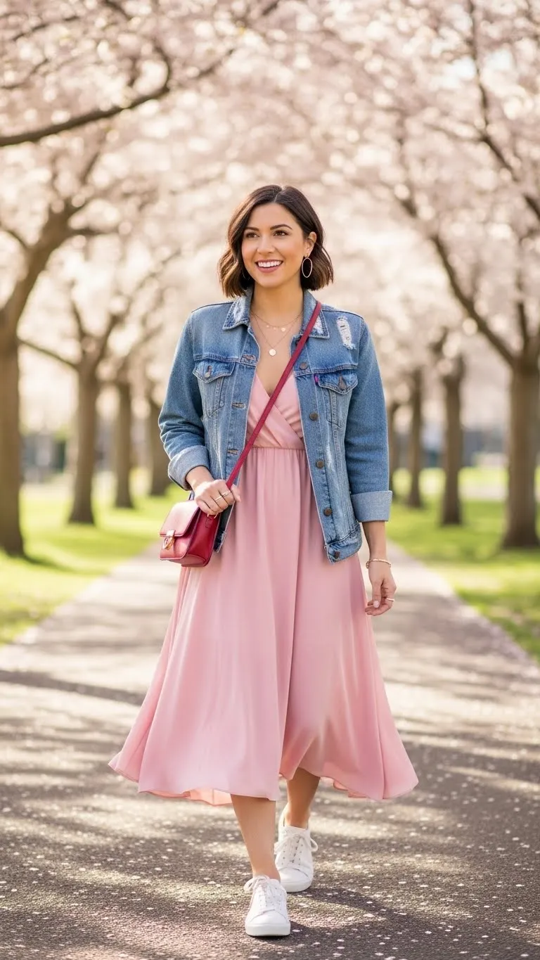 - Denim Jacket Over Pink Midi Dress