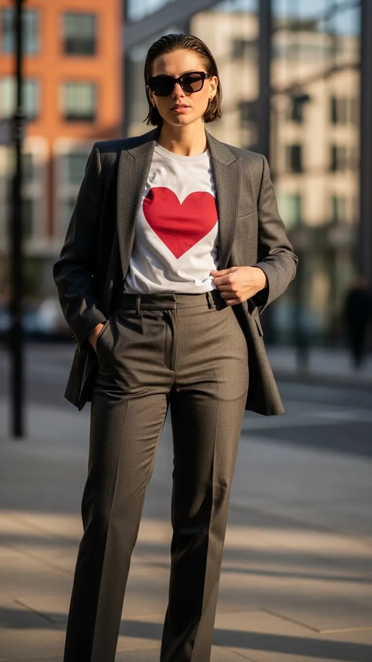 This outfit mixes playful and polished. A heart graphic tee adds personality. A blazer pulls it together. Many already own a black or neutral blazer. Graphic tees cost little and are easy to find online. DIY iron-on heart patches work well. Pair with straight-leg pants or jeans. Sneakers keep it casual. Loafers dress it up slightly. This outfit suits workdays, lunch dates, or errands. Keep colors simple so the heart stands out. Roll blazer sleeves to relax the look. You can swap the tee later for another graphic. The blazer stays useful year-round. You get fun without buying a whole new outfit.
