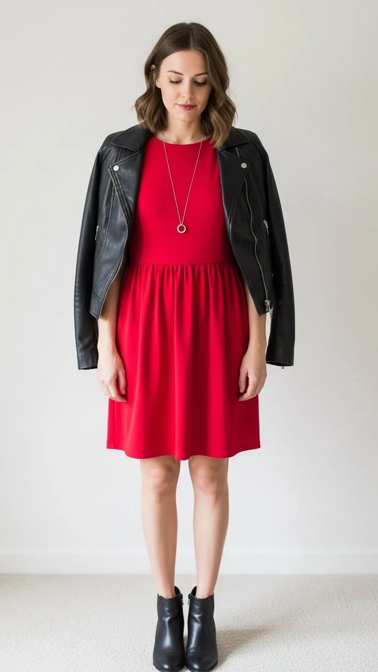 Pairing a black leather jacket with a red top creates a bold, modern Valentine’s look. The leather jacket adds edge, while the red top keeps the theme playful. Most people already own black jackets, so the only investment may be the red top, which can be affordable from retailers or thrift stores. Pair with black jeans, leggings, or a skirt. Ankle boots or sneakers finish the look depending on the vibe. Minimal accessories, like a chain necklace or small hoop earrings, enhance without cluttering. For a DIY touch, you could add a heart patch or pin to the jacket. This outfit is perfect for evening plans, casual dinners, or coffee dates. People save this outfit because it balances bold and wearable effortlessly, and the pieces are easy to remix for everyday use.
