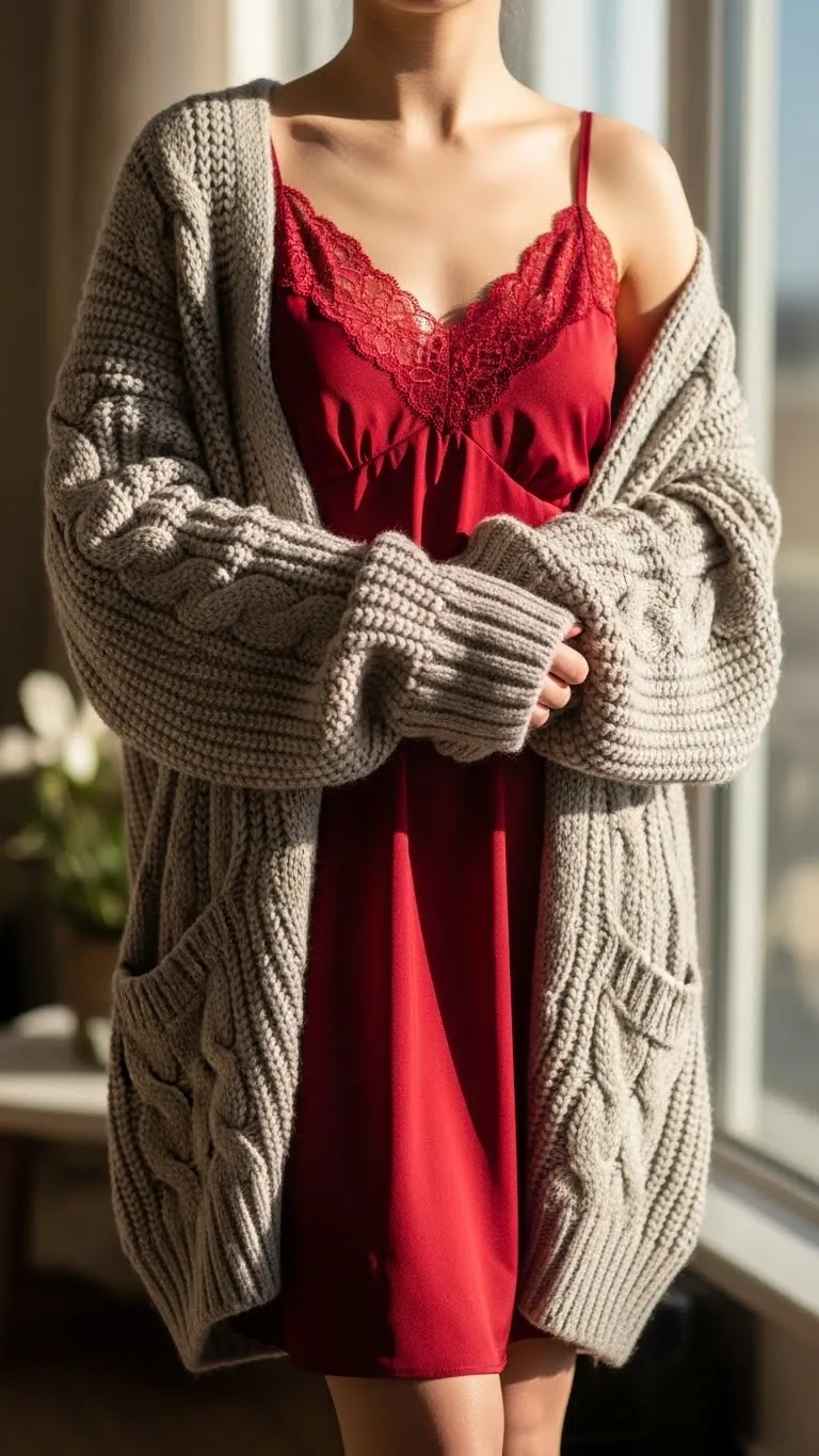 A red slip dress sets the tone fast. Adding a chunky cardigan keeps it cozy and wearable. Slip dresses often go on sale after holidays. Cardigans can come from thrift shops or your own closet. Choose neutral colors like cream or gray. Style with ankle boots or ballet flats. If straps feel too dressy, layer a fitted tee underneath. That trick makes it daytime-friendly. Use a belt to define shape if wanted. Keep jewelry minimal. A small pendant works. This outfit works for dinner, movie night, or even staying in. Swap the cardigan for a denim jacket later. You don’t need heels to make it work. Comfort keeps it realistic.