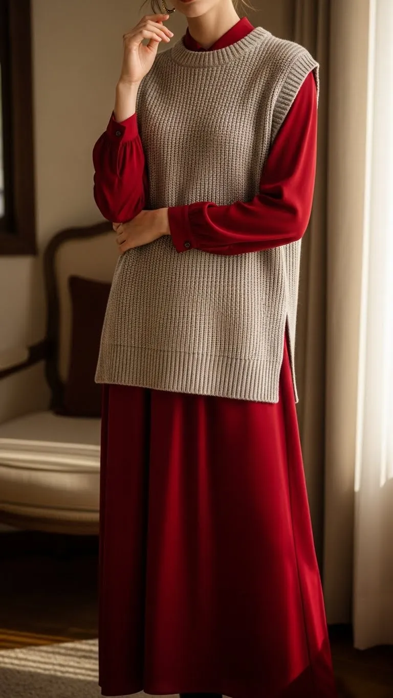 - Sweater Vest Over Long-Sleeve Dress