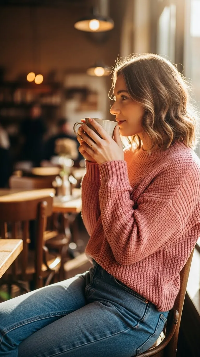 The off-shoulder sweater adds flirty charm without being over-the-top. Pair it with a midi skirt in a complementary soft shade, like blush, cream, or muted red, to create a romantic silhouette. Sweaters can be thrifted or worn from your existing collection, while midi skirts are versatile pieces that can mix and match with multiple tops. Pair this outfit with ankle boots, loafers, or flats depending on your plans. Roll the sweater sleeves slightly to create a casual touch. Add delicate gold or silver jewelry—think thin chains or small hoop earrings. For DIY flair, attach a small ribbon at the hem or tie it in your hair. This look works for lunch dates, daytime strolls, or indoor dinners. People save it because it’s wearable, comfortable, and feels special without requiring a lot of effort. Layer a coat or cardigan over it if the weather is cooler.