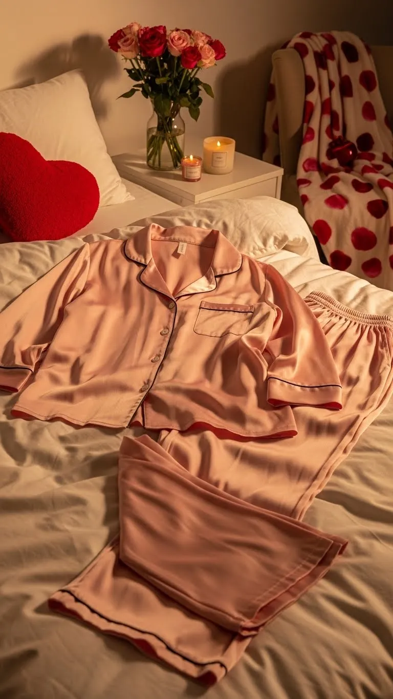 Staying in doesn’t mean compromising style. Matching pajama-inspired sets in pink or red create a relaxed, intentional look for movie nights or at-home Valentine celebrations. Choose cotton or silk-blend sets for comfort. Accessories like fuzzy socks, slippers, or a soft headband make it feel playful and cozy. Minimal makeup, like a tinted lip balm or mascara, enhances the vibe without effort. You can mix and match tops and bottoms from different sets for a slightly different look. People save this idea because it makes staying home feel special. It’s affordable, comfortable, and cozy—perfect for those who prefer intimate nights in. A small DIY touch, like a ribbon tied around the waist, can add charm. This look demonstrates that Valentine outfits don’t always need to go out; they can be stylish in comfort too.