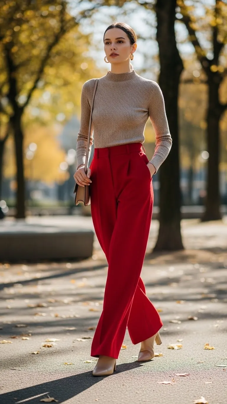 Red pants make a statement without a full red outfit. Pair them with a neutral beige, white, or gray top to balance the bold color. Shoes can remain neutral as well—white sneakers or black flats work best. This outfit is great for casual lunches, work, or evening walks. Thrift stores and sales are excellent places to pick up budget-friendly colored trousers. A thin belt or small jewelry keeps the look polished. People save this outfit because it’s bold, playful, and easy to repeat with other neutral tops in your wardrobe.