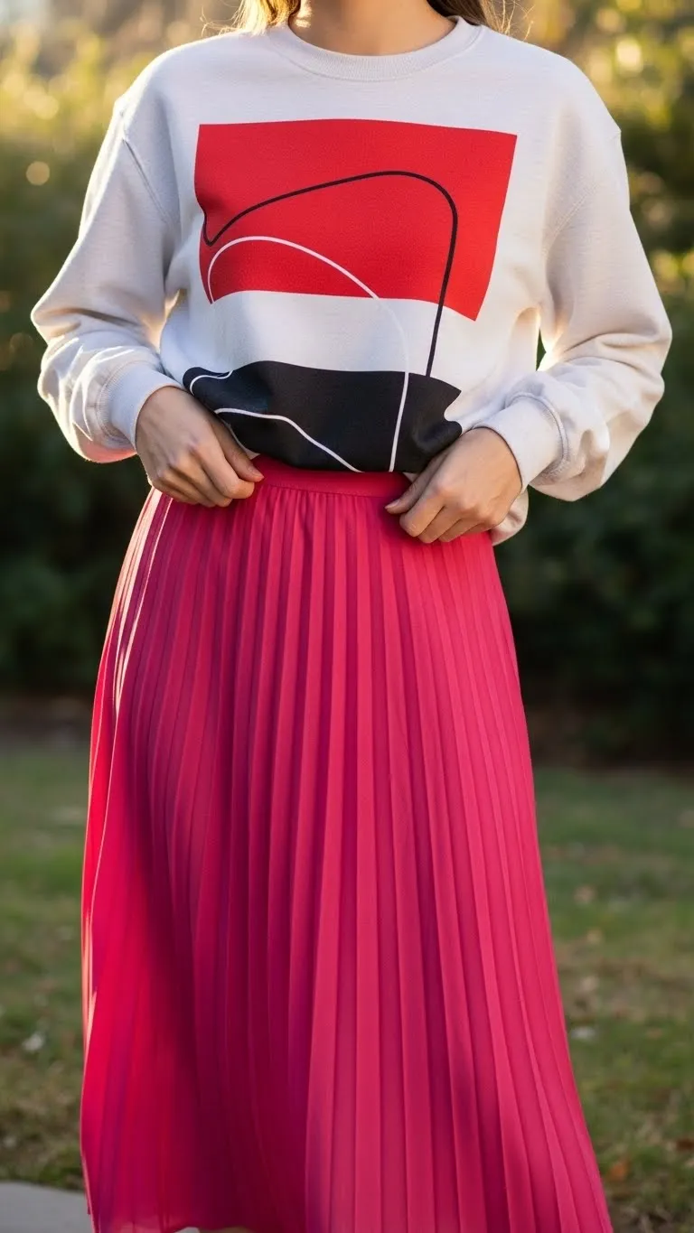 Pairing a graphic sweatshirt with a soft pink skirt balances casual and playful vibes. Sweatshirts can be from your closet or thrifted. Skirts in soft pink or pastel shades work for Valentine’s Day. Add sneakers for comfort or boots for edge. Minimal accessories, like small earrings, keep the outfit clean. Roll sleeves or partially tuck the sweatshirt for shape. People save this look because it’s fun, affordable, and comfortable. It works for brunch, walks, or casual indoor outings. DIY iron-on patches or ribbons add charm at very low cost.